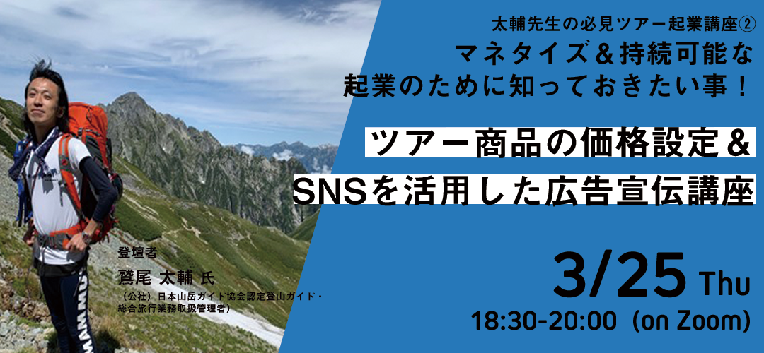 【Skill Upセミナー】太輔先生の必見ツアー起業講座② マネタイズ&持続可能な起業のために知っておきたい事!ツアー商品の価格設定&SNSを活用した広告宣伝講座