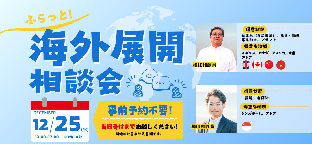 ふらっと!海外展開相談会は、アイデア段階での相談から実際に展開するうえでのアドバイスまで、海外展開に関するあれこれを海外ビジネス経験豊富な相談員に気軽に相談できる個別相談会です。