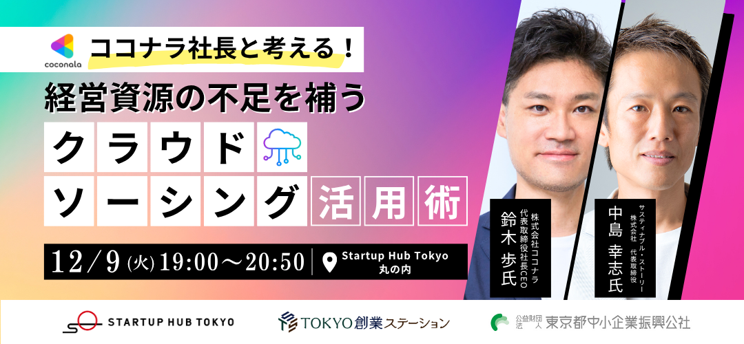 そして、第2部では外部人材活用サービスを手掛ける「株式会社ココナラ」の鈴木歩社長にご登壇いただき、当該サービスを活用することで起業や事業成長を果たした起業家の事例やサービス活用のポイントをトークセッション形式でお届けします!