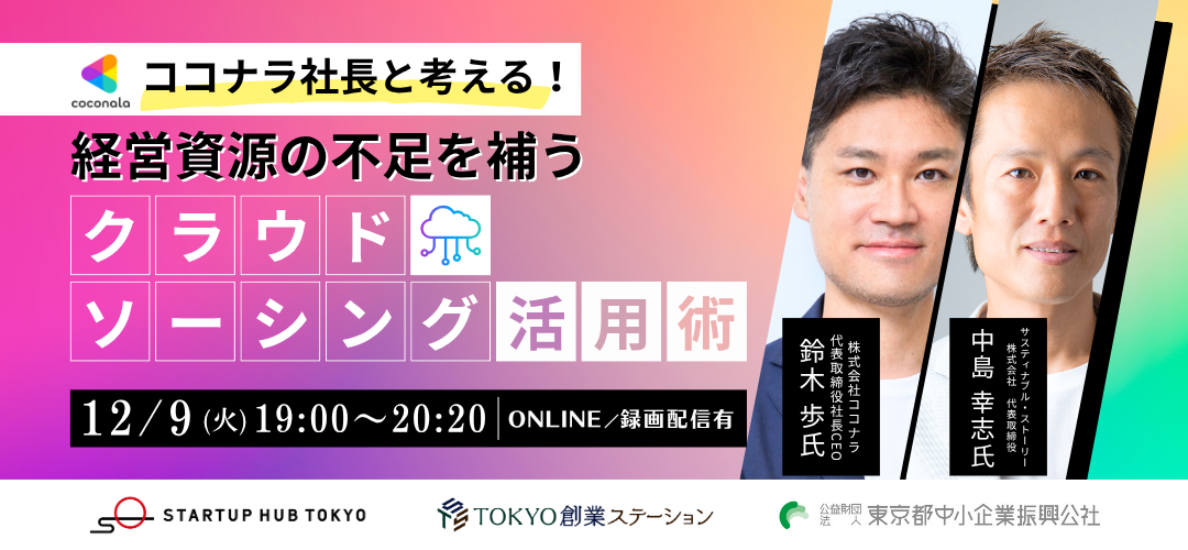 そして、第2部では外部人材活用サービスを手掛ける「株式会社ココナラ」の鈴木歩社長にご登壇いただき、当該サービスを活用することで起業や事業成長を果たした起業家の事例やサービス活用のポイントをトークセッション形式でお届けします!