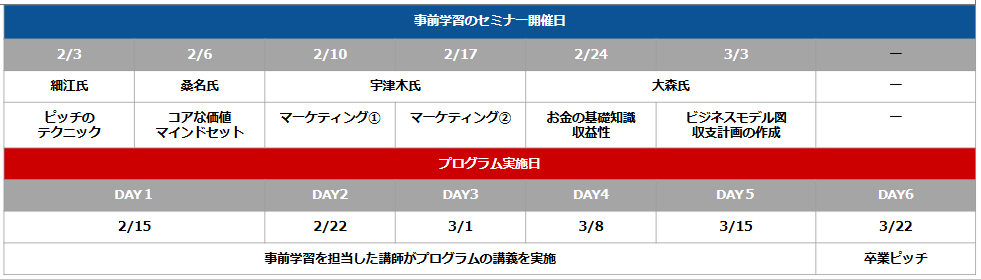 各回3時間という限られた時間の中で、実践的なワークショップやグループディスカッションを行うため、各回テーマの基本的な知識を学ぶセミナー「起業アイデアを可視化する6つのステップ」を事前に行います。