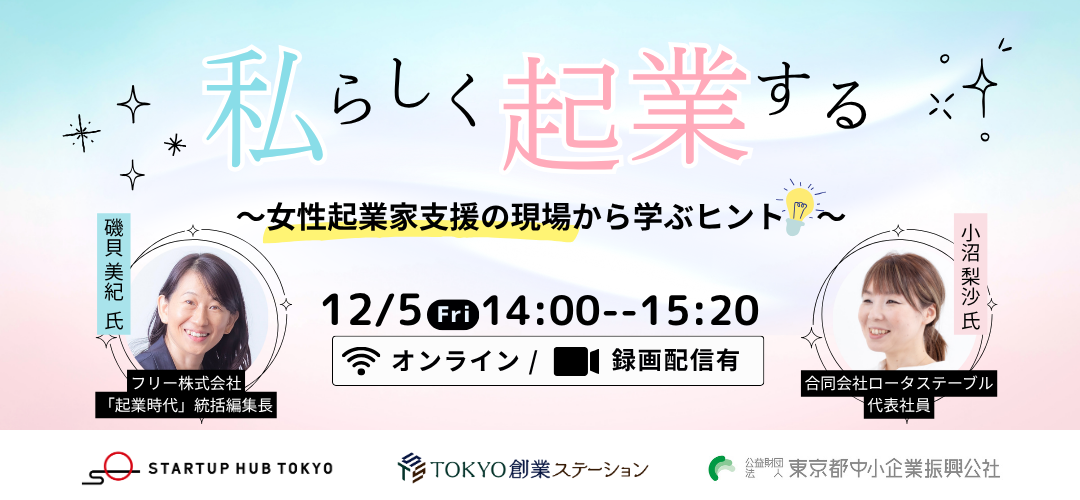本イベントでは、起業や経営支援に携わる小沼梨沙氏と起業家の取材活動を重ねてきた磯貝美紀氏をゲストに招き、女性起業家支援の現場(数多くの女性起業家を客観的に見守ってきた立場)から一人ひとり異なる「『私らしい起業』のカタチをどう見つけ、どう実現していけば良いのか」を考えるヒントをトークセッション形式で語っていただきます。「『私らしい起業』は叶えたいけど、一歩がなかなか踏み出せない」という方に参加いただきたいイベントです!