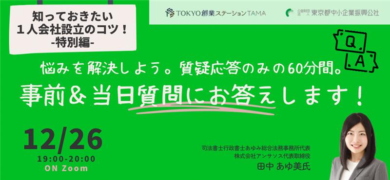 【Skill Upセミナー】知っておきたい1人会社設立のコツ!(特別編)~悩みを解決しよう。質疑応答のみの50分。事前&当日質問にお答えします!!【録画配信あり】