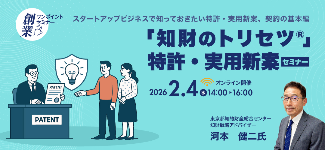 【ワンポイントセミナー】「知財のトリセツ®」特許・実用新案セミナー スタートアップビジネスで知っておきたい特許・実用新案、契約の基本編(録画配信あり)