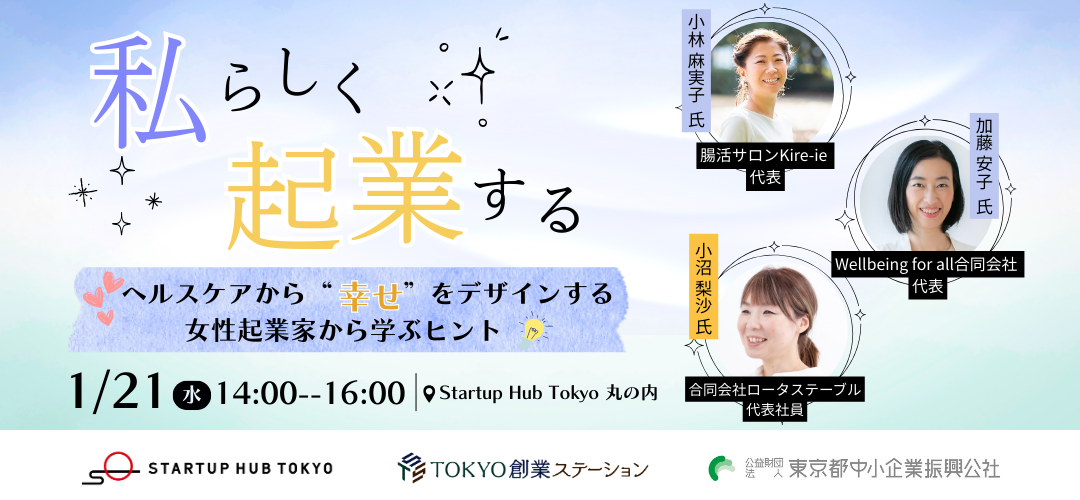 本イベントでは、女性起業家の創業・経営支援に携わる小沼梨沙氏をモデレーターに迎え、ヘルスケア領域で起業された女性起業家2名(加藤 安子氏、小林 麻実子氏)に起業のリアルな経験談をトークセッション形式で伺っていきます。「『私らしい起業』を目指したいけど、一歩がなかなか踏み出せない」という方に参加いただきたいイベントです!