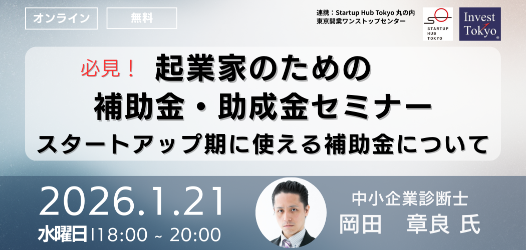 また、東京開業ワンストップセンターでも相談が多い東京都の創業助成金をはじめ、スタートアップ期に使える補助金がどのようなケースで使えるのか、申請する際のポイントについても説明します。