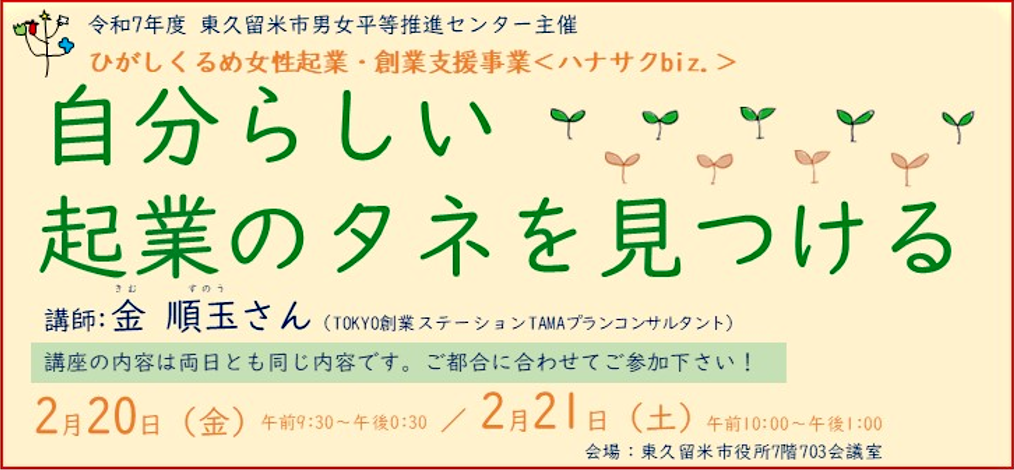 【東久留米市男女平等推進センター主催】ひがしくるめ女性起業・創業支援事業<ハナサクbiz.> 自分らしい起業のタネを見つける
