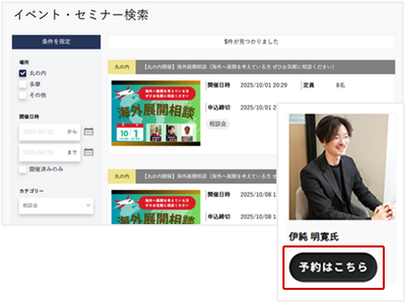 イベント・セミナー検索ページからご希望日のイベントページを選択いただき、「予約はこちら」ボタンより予約フォームに進んでください。