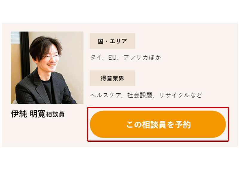 「海外展開について相談したい」と思ったら、先ずは各相談員の得意業界や国・エリアをチェックしましょう。あなたのビジネスに合った相談員が⾒つかったら、各相談員のシフトを確認して、「開催日時から予約」「相談員を選んで予約」からお申込みください。
