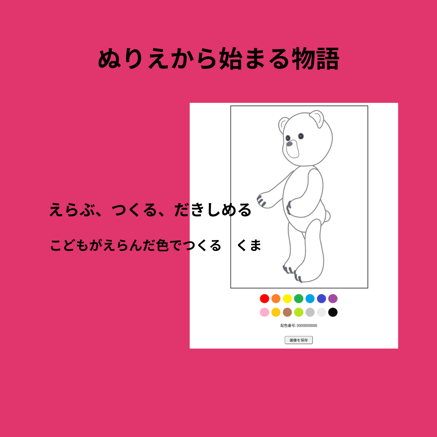 タブレットなどを使い、WEB上でくまのイラストのぬり絵を楽しんでいただけます。また、実物のあみぐるみのくまを数色ご用意しています。頭・胴・手・足の各部位を付け替え、いろいろな色を自由に組み合わせる体験ができます。色の魔術師としてのこどもの姿を見ることができるでしょう