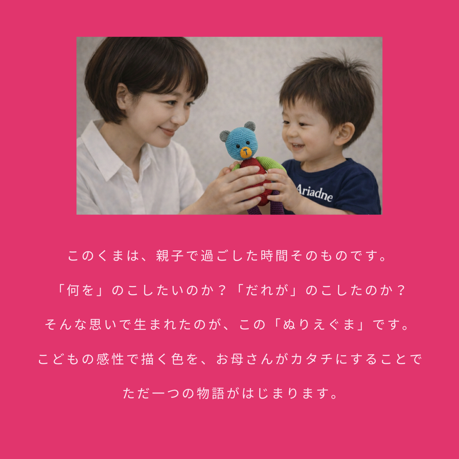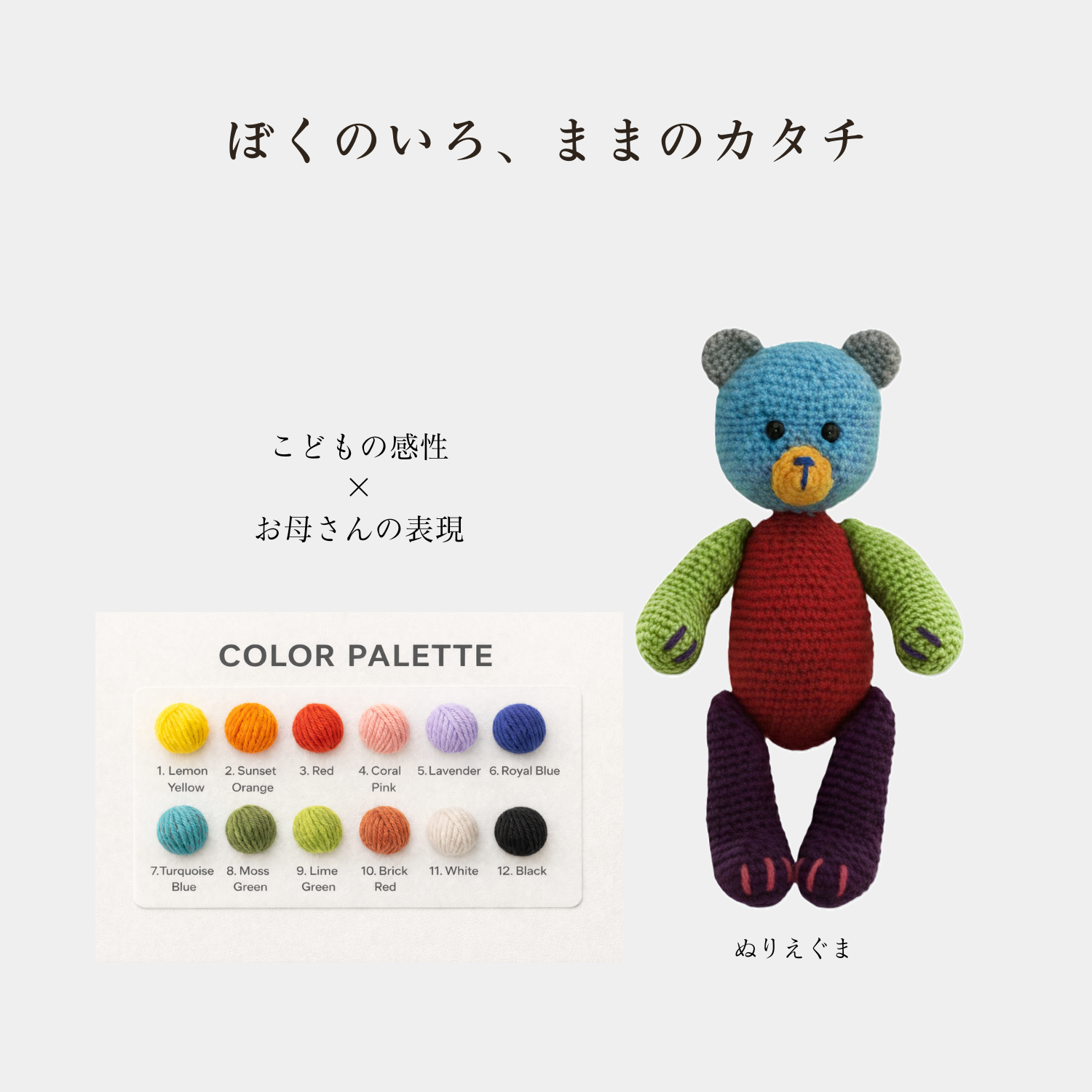 本商品は、私自身の経験から「こんなものがあったらいいな」と感じた、二つの想いの組み合わせから生まれました。一つは、子どもの頃に描いた絵や作品を見返したとき、そこに当時の感性や内面がそのまま閉じ込められていることに気づいた経験です。もう一つは、セーターのほつれを祖母が直してくれたことがきっかけで、そのセーターを着るたび、見るたびに祖母のことを思い出した経験です。これらの経験から「誰が、何を、どんな想いで残したのか」をかたちにできる本商品を企画しました。Web上で子どもがくまの部位の色を自由に選び、その色の毛糸を使ってお母さんが一目一目編み上げます。色彩には子どもの感性が、編み目にはお母さんの想い(しるし)が込められた、二人でしか作れない世界にただ一つだけの存在が生まれます。年月が経ったとき、そのくまを手に取れば、いつでも当時の美しい時間を思い出し、楽しむことができる、【子どもの感性 × お母さんの表現 = 立体アルバム】です。
