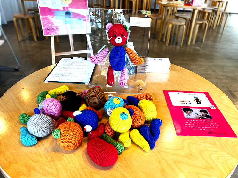 タブレットなどを使い、WEB上でくまのイラストのぬり絵を楽しんでいただけます。また、実物のあみぐるみのくまを数色ご用意しています。頭・胴・手・足の各部位を付け替え、いろいろな色を自由に組み合わせる体験ができます。色の魔術師としてのこどもの姿を見ることができるでしょう
